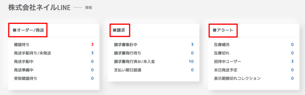 ・ステータス(■オーダー/発送 ■請求 ■アラート)