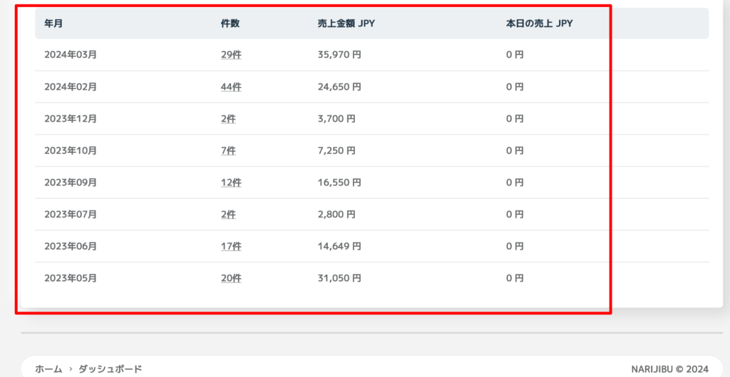 下の段には、毎月の「注文件数」と「売上金額」と「本日の売上」が表示されます。