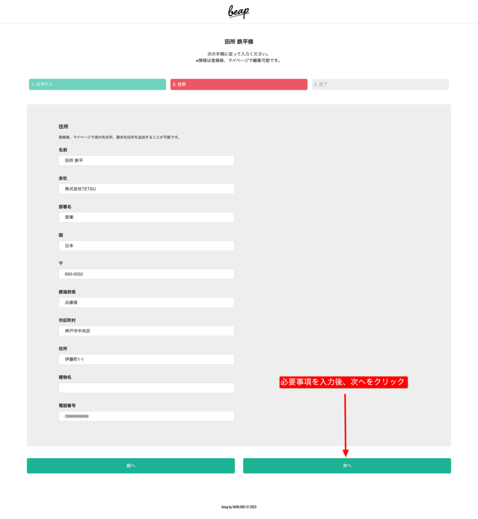 住所など必要事項を入力。「次へ」をクリック