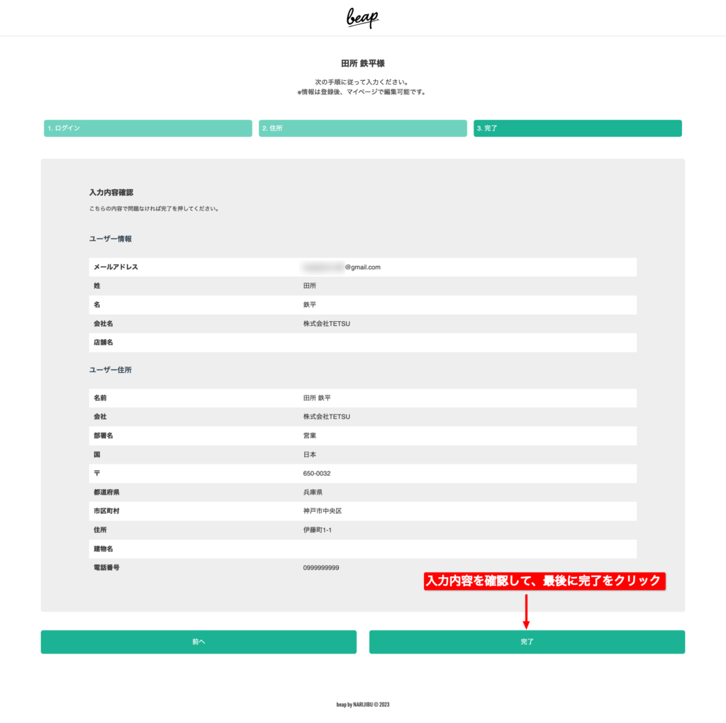 最終確認画面が出ます。確認して「完了」をクリック