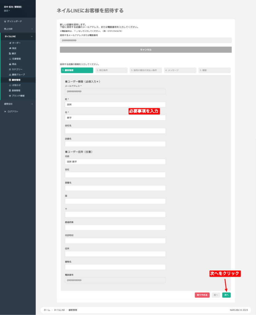 問題なければ、顧客情報を入力後、「次へ」