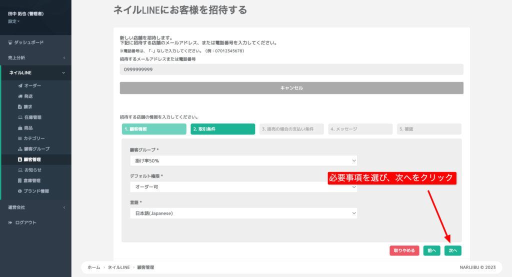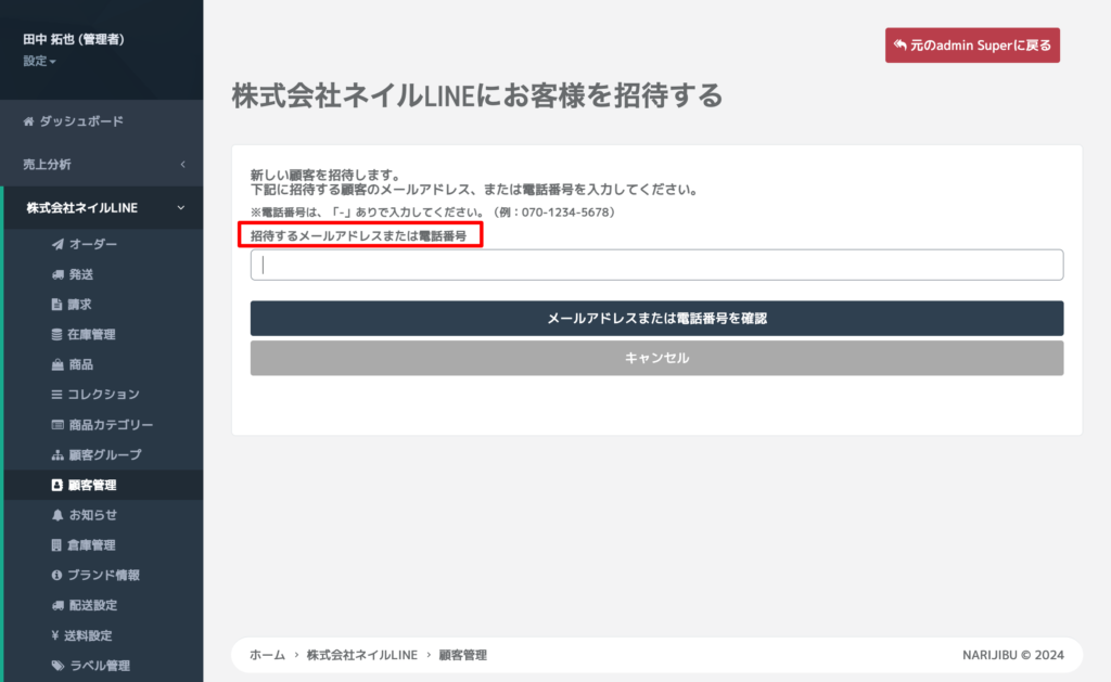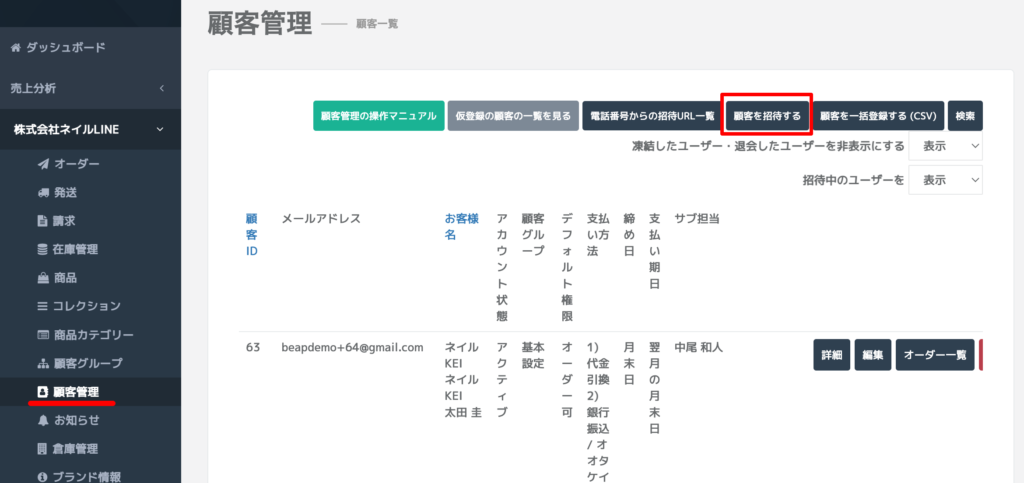 顧客管理より「顧客を招待する」をクリック