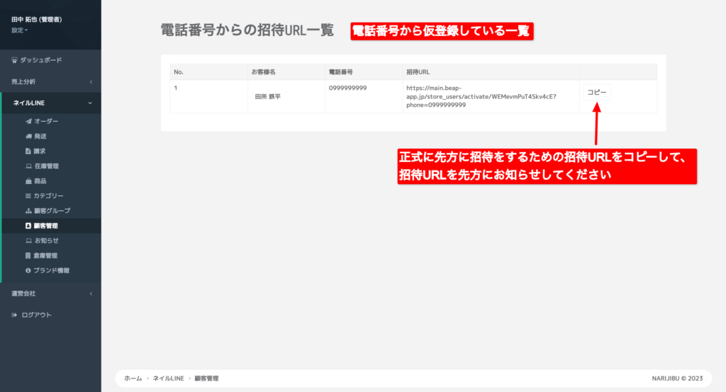 仮登録した顧客を正式に招待する場合、「電話番号から招待URL一覧」をクリック