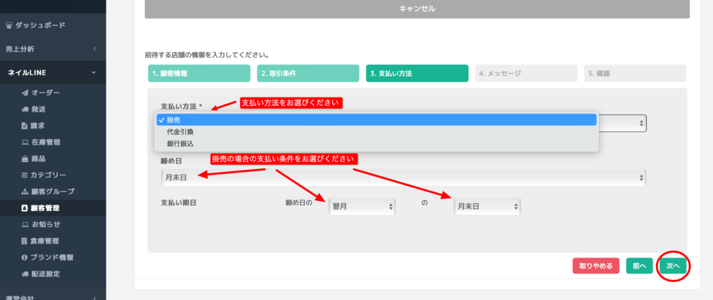 支払い方法と支払い条件をお選び後、「次へ」