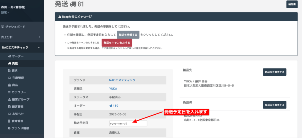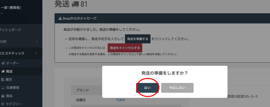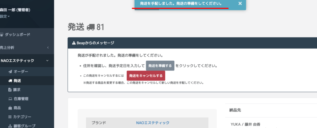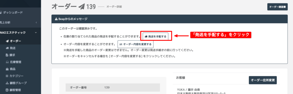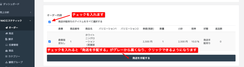 ステータスが「発送手配待ち」に変わります。その後、「詳細」をクリック