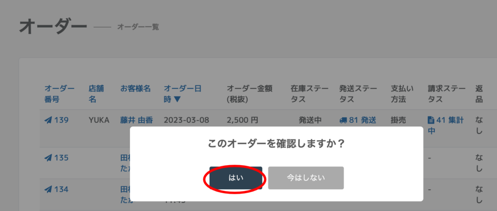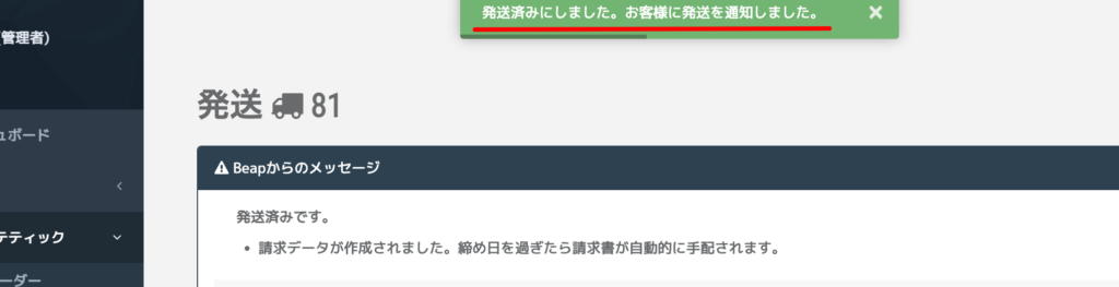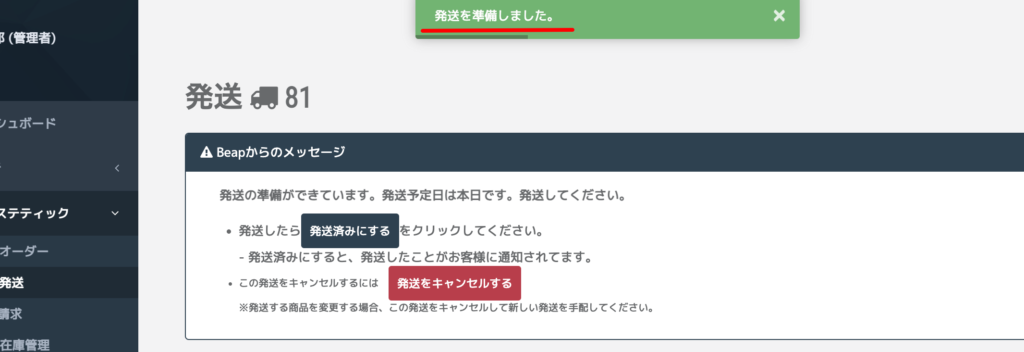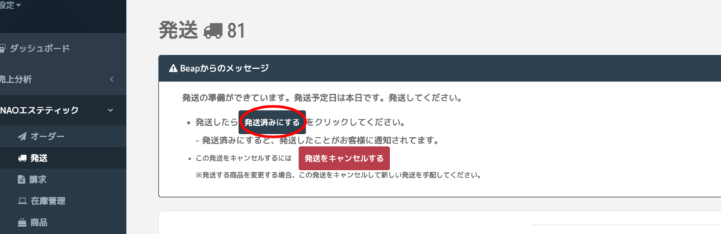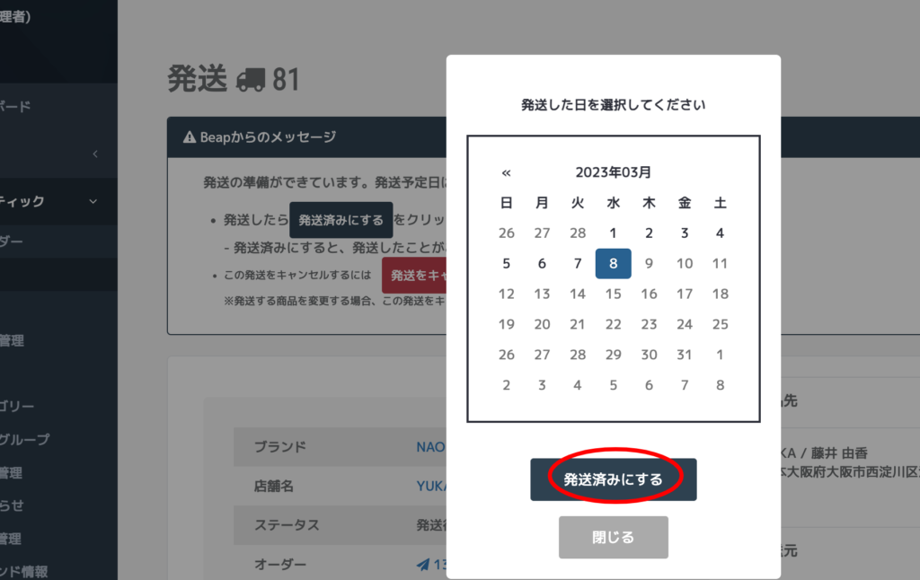 確認画面がでますので、発送した日を選択し、「発送済みにする」をクリック