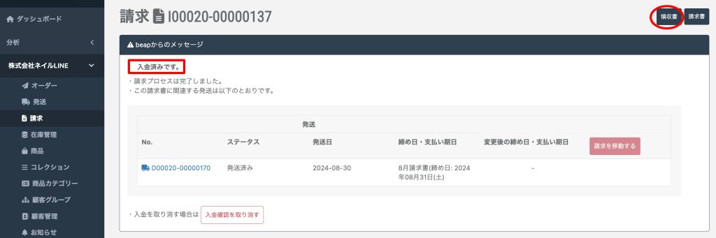 ステータスが入金済みになり、領収書が発行できます。