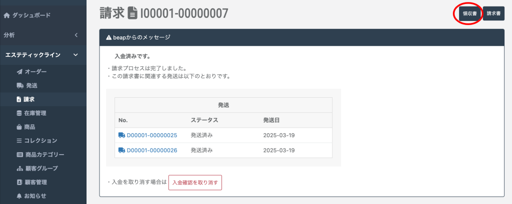 サイドバー「請求」から、入金済みにした該当のオーダーを選びます