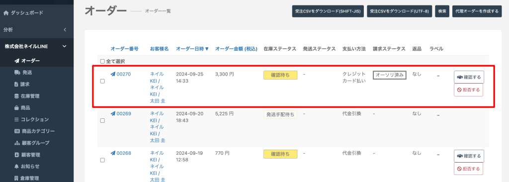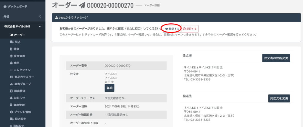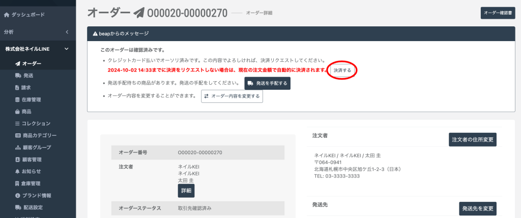 ②オーダー内容を確認します。送料など変更がある場合は、修正します。