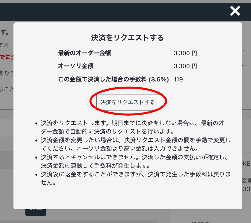 ポップアップで、内容を確認し、「決済をリクエストする」をクリック