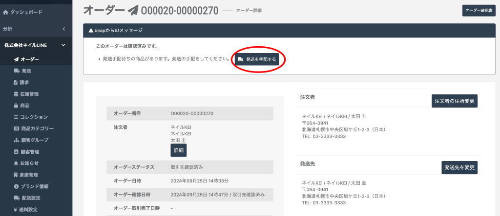 発送日を入力、配送業者、発送先などを確認後、「発送を準備する」をクリック
