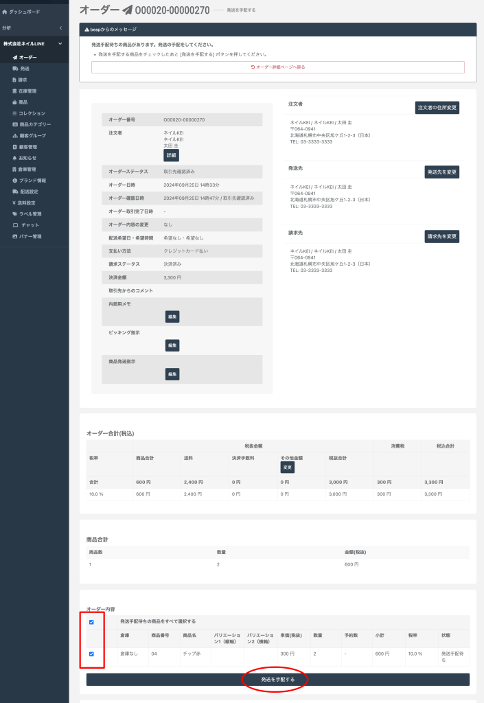 商品な内容を確認して、発送する商品にチェックを入れ、「発送を手配する」をクリック
