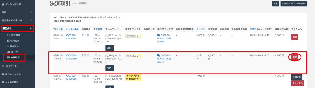 返金したい取引の「返金」ボタンをクリック
