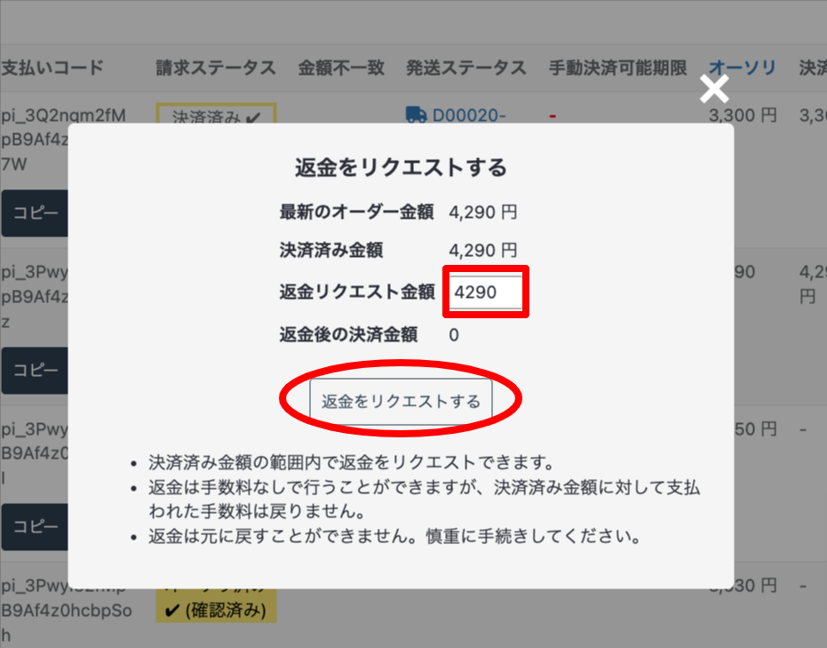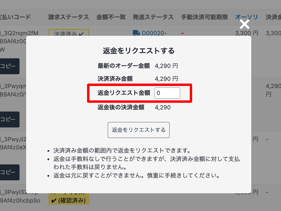 決済済みの金額の一部のみ返金する場合、