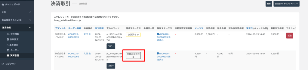 全額の場合は、全額返金済みと表示されます。