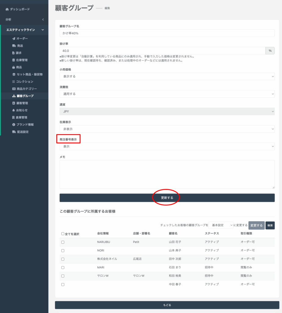 顧客グループの編集より、発注番号の表示を「表示」に設定、「更新する」をクリック