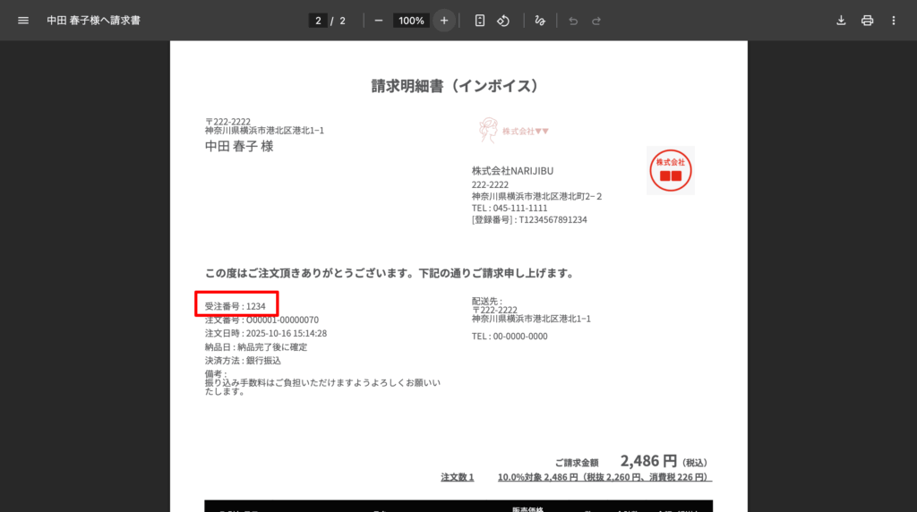 発注番号は、納品書・請求書・領収書にも表示されます